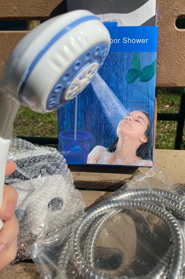 Все остальное для комфортного использования входит в комплект. Заранее заряженный душ нужно включить, сразу поместив насос душа в воду, а затем использовать.